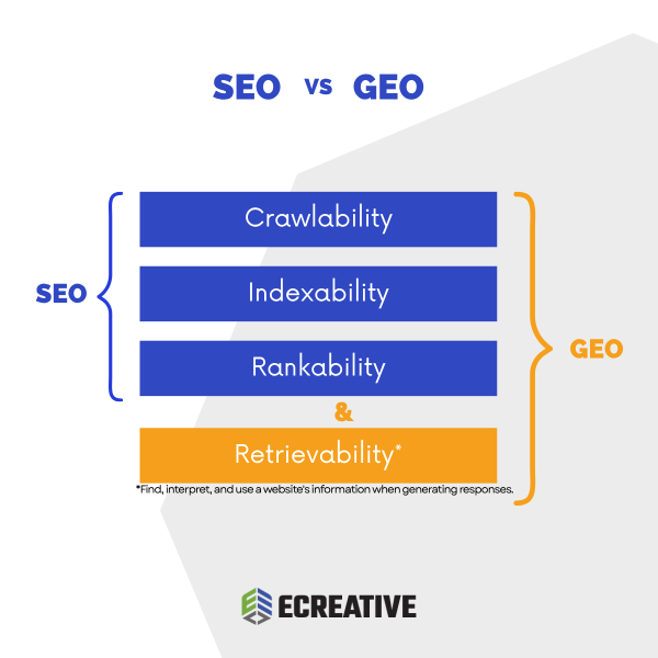 You can absolutely start implementing GEO strategies on your own! But partnering with marketing experts can help you take it further (faster!).At Ecreative, we monitor digital marketing trends, strategies, and data to stay on top of the ever-changing world of digital marketing. With over 20 years of experience, we help industrial B2B companies adapt to digital shifts. We’re already adjusting our strategies to leverage GEO with SEO and boost visibility, engagement, and leads for our clients. How?